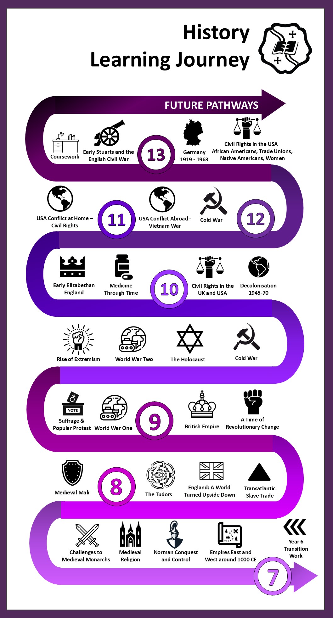 The Key Stage 5 curriculum offers students the opportunity to explore a broad and diverse curriculum through the OCR exam board. Students in Year 12 study two pivotal moments in British and European History through the exploration of the Causes of the English Civil War and the Rise of Nazi Germany. Students in Year 13 investigate a diverse history of different marginalised groups in American society and their competing narratives through an in-depth study of Civil Rights in the USA. These topics encourage students to study in greater depth the topics that they have been introduced to at Key stage 3 and 4, allowing students to pick up core narrative threads that underpin political, ideological, religious, economic and social themes.